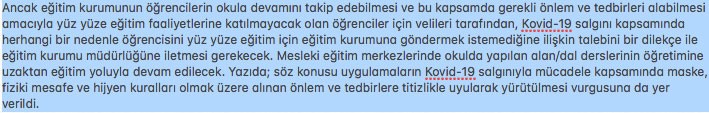 Yüz yüze eğitim isteğe bağlı olacağı açıklandı. Yüz yüze eğitimle yürütülecek eğitim ve öğretim faaliyetlerine katılım isteğe bağlı olacak, devam zorunluluğu aranmayacak.