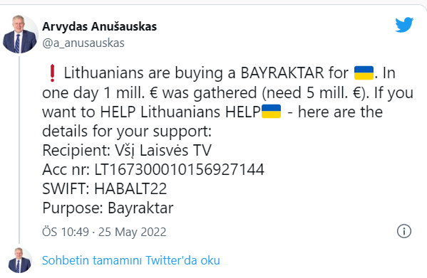 Türkiye'den SİHA satın alarak bunları Ukrayna'ya göndereceklerini ifade eden Anusauskas, IBAN numarası paylaşarak, 5 milyon dolara ihtiyaçları olduğunu, Litvanyalıların şu ana kadar 1 milyon dolarını topladığını belirtti.