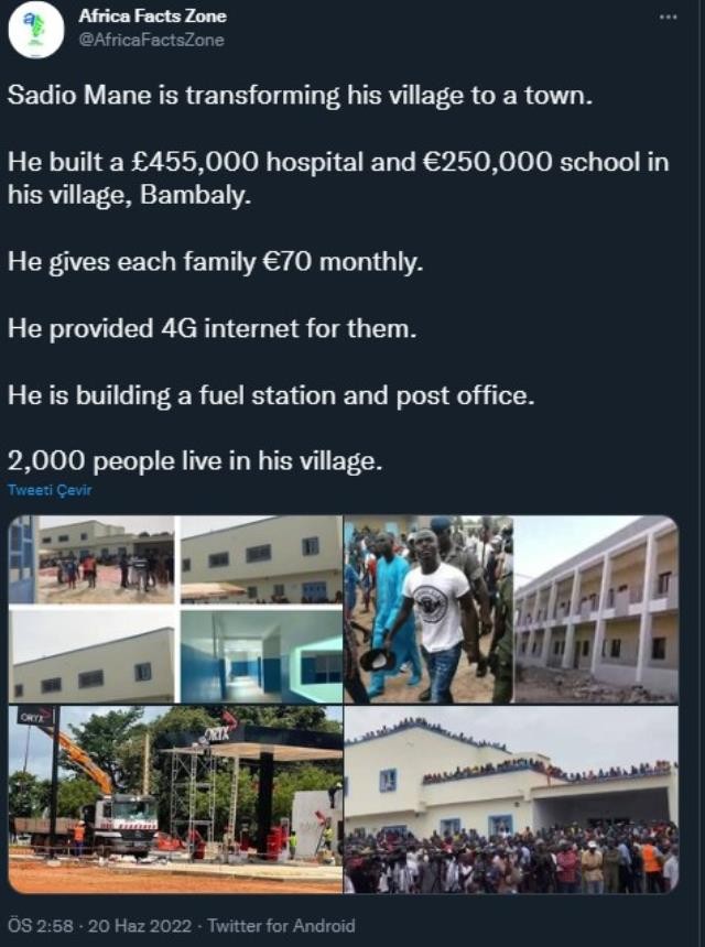 Africa Facts Zone'da yer alan habere göre; Mane, yaptırdığı hastane ve okulun yanı sıra, orda yaşayan her aileye aylık 70 euro ve 4 GB internet desteği veriyor. Senegalli yıldız ayrıca bir akaryakıt istasyonu ve postane de inşa ettiriyor.