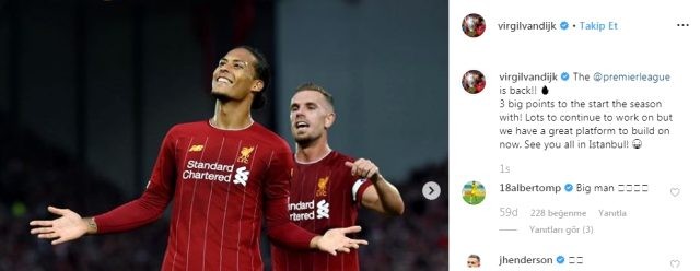 Şampiyonlar Ligi şampiyonu Liverpool ile UEFA Avrupa Ligi şampiyonu Chelsea arasında 14 Ağustos tarihinde Vodafone Park'ta oynanacak olan UEFA Süper Kupa maçı öncesinde Liverpool'un yıldız ismi Virgil van Dijk'tan İstanbul paylaşımı geldi.
