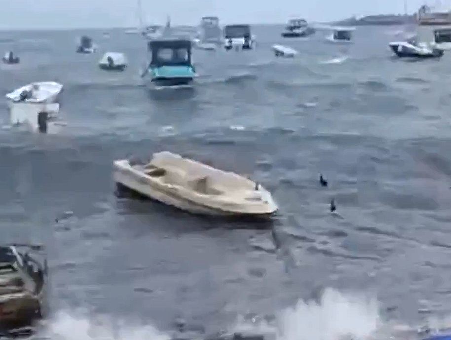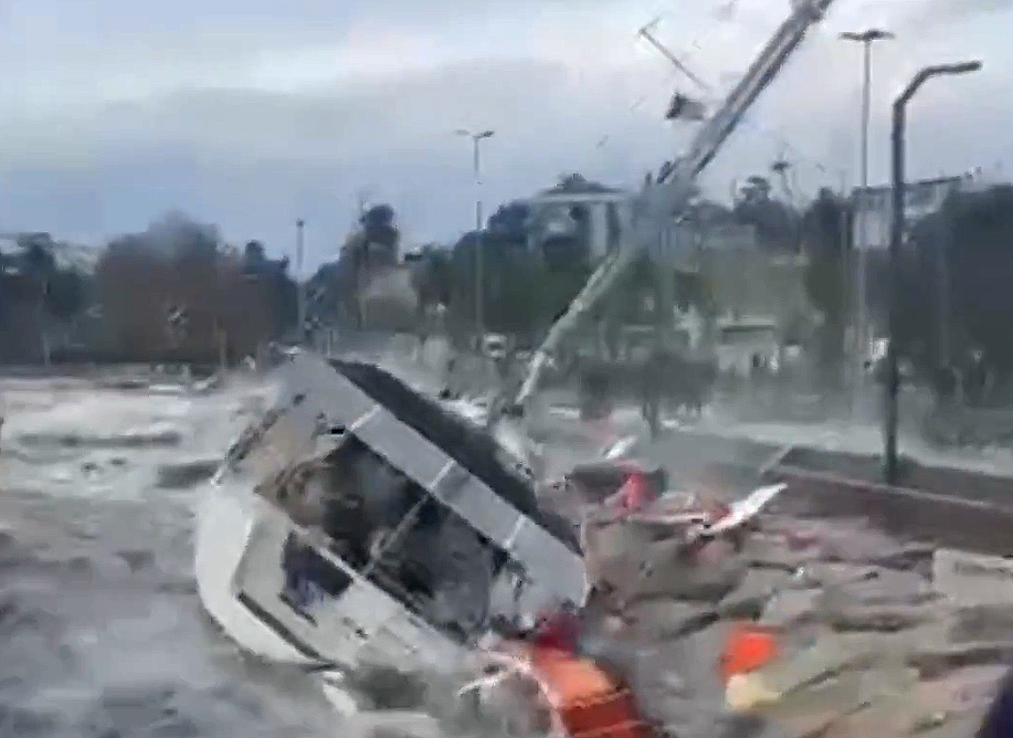 Sosyal medyada paylaşılan görüntülerde, kıyıya bağlı olan büyük bir teknenin dev dalgalar tarafından defalarca sarsıldığı ve sonunda yan yatarak batmaya başladığı görülüyor.