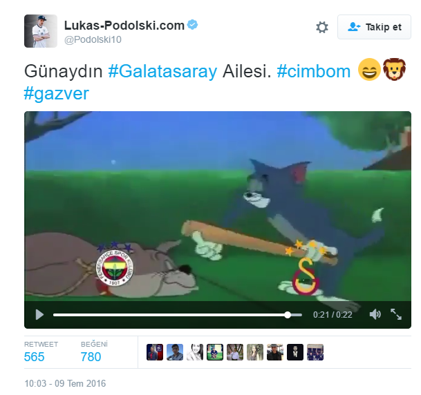Podolski'nin bu tweeti Galatasaray taraftarı tarafından kısa sürede yüzlerce kez retweet edilirken, Fenerbahçelilerden ise tepki mesajları geldi.
