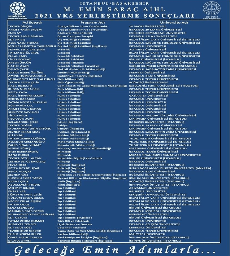 Özellikle M. Emin Saraç Anadolu İmam Hatip Lisesi öğrencilerinin yerleştiği bölüm ve üniversiteler, “Maşallah” dedirtti. Büyük İslam Alimi Muhammed Emin Saraç hoca efendinin isminin verildiği M. Emin Saraç İmam Hatip Lisesi başarılarıyla göz doldurdu, okullarına ismini veren büyük alimi utandırmadı.