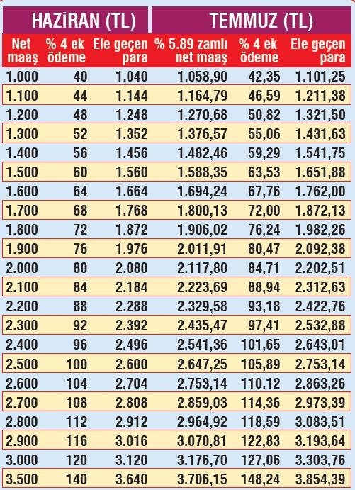- Bin 500 lira olan net maaşa yüzde 5.89 enflasyon zammı ekleniyor. Temmuz ayı net maaşı bin 588 lira 35 kuruş (1.500 x % 5.89 = 1.588,35) oluyor.
