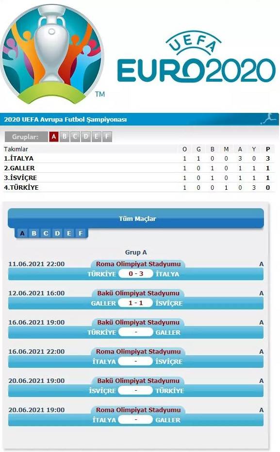 16. Avrupa Futbol Şampiyonası (EURO 2020) A Grubu'nda ilk karşılaşmalar sonrası İtalya zirvede, Türkiye ise son sırada yer aldı.