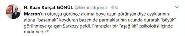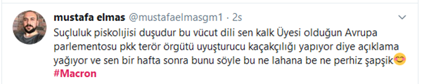 Macron’un hareketlerine sert tepki gösteren Cumhurbaşkanı Recep Tayyip Erdoğan, “Sen kendi beyin ölümünü kontrol ettir” demişti.