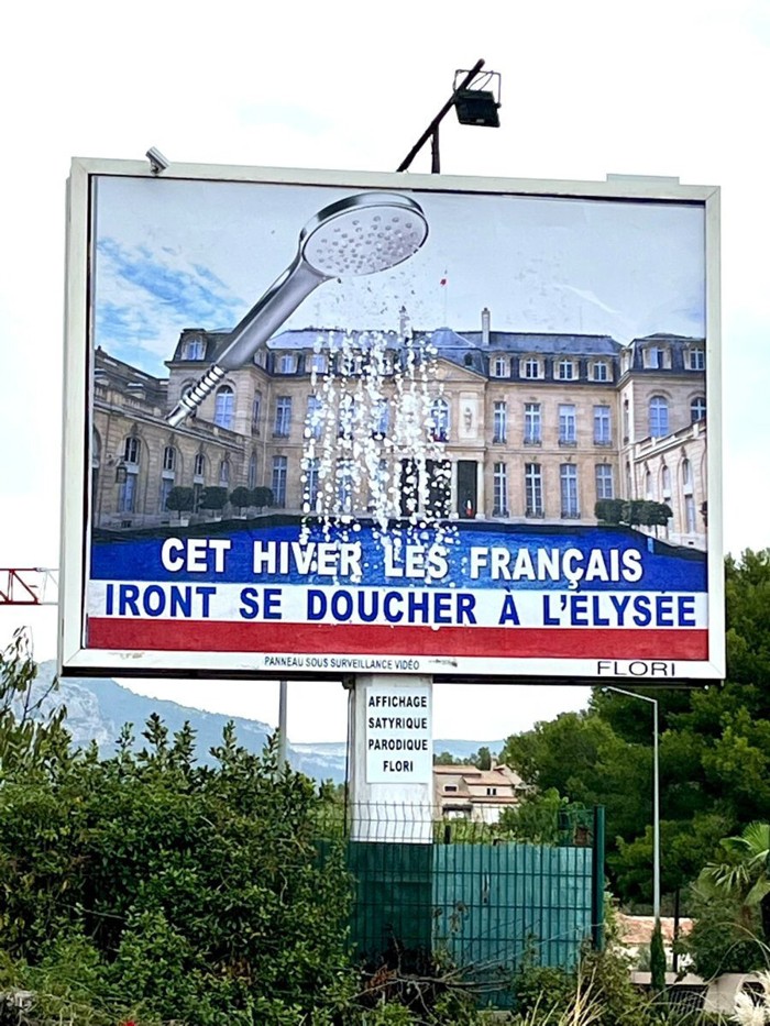Fransa'da enerji krizinin elektrik ve doğal gaz kesintilerine yol açması durumunda halkın banyo yapma sıkıntısı yaşayacağına dikkati çekmek için hazırlanan fotomontajlı "duş başlıklı Elysee Sarayı" afişi gündem oldu.