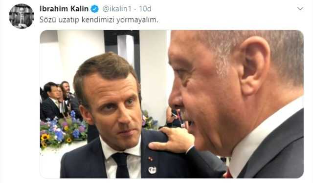 Haddini aşan Fransa Cumhurbaşkanı Emmanuel Macron'un "Bizim sorunumuz Erdoğan'la" şeklindeki skandal sözlerine bir tepki de Cumhurbaşkanlığı Sözcüsü İbrahim Kalın'dan geldi. Kalın, Erdoğan'ın Macron'un omzuna elini koyduğu ve sosyal medyanın efsaneleri arasına giren fotoğrafı paylaştı.