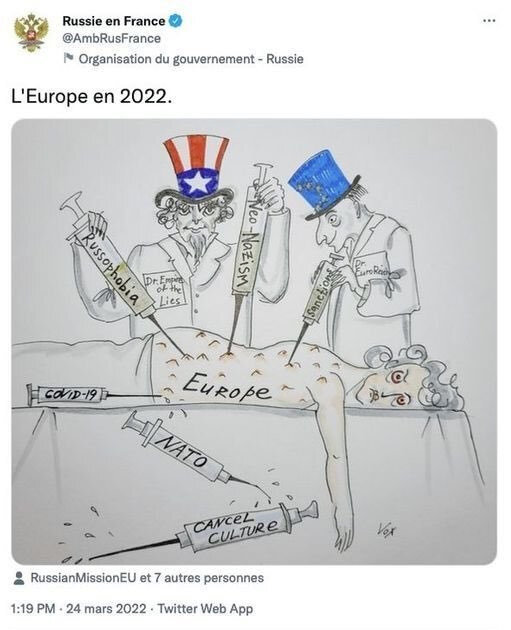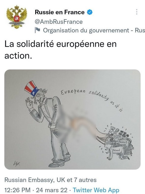 Rusya'nın Fransa Büyükelçiliği'ne ait sosyal medya hesabından, Avrupa ülkelerini hedef alan bir karikatür paylaşıldı.