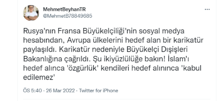 Milat gazetesi yazarı Mehmet Beyhan, Macron'un tarihi iki yüzlülüğüne vurgu yaptı. Twitter hesabından paylaşımda bulunan Beyhan, "Rusya'nın Fransa Büyükelçiliği'nin sosyal medya hesabından, Avrupa ülkelerini hedef alan bir karikatür paylaşıldı. Karikatür nedeniyle Büyükelçi Dışişleri Bakanlığına çağrıldı. Şu ikiyüzlülüğe bakın! İslam'ı hedef alınca 'özgürlük' kendileri hedef alınınca 'kabul edilemez' " ifadelerini kullandı.