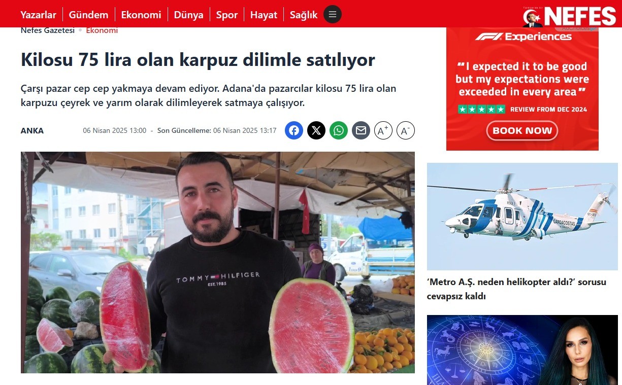 Sözcü gazetesinden ayrılarak Nefes gazetesini kuran ekip, yeni yerinde de algıda sınır tanımıyor. Yaz meyvesi olan henüz yeni çıkan karpuz üzerinden algı için kolları sıvayan Nefes ekibi, “Kilosu 75 lira olan karpuz dilimle satılıyor” haberiyle Sözcü’de olduğu gibi algı operasyonlarını sürdürdü.