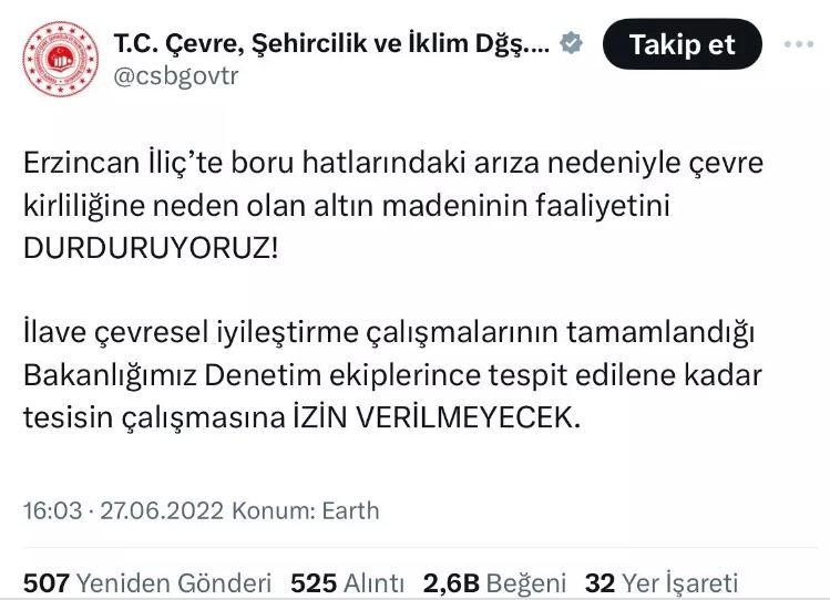 Yaşanan siyanür sızıntısı olayla ilgili dönemin Çevre, Şehircilik ve İklim Değişikliği Bakanı Murat Kurum'a yönelik 'madene yaptırım uygulanmadığı' algılarının ardından Çevre, Şehircilik ve İklim Bakanlığı'nın o dönem madenle ilgili yaptığı paylaşım gündem oldu.