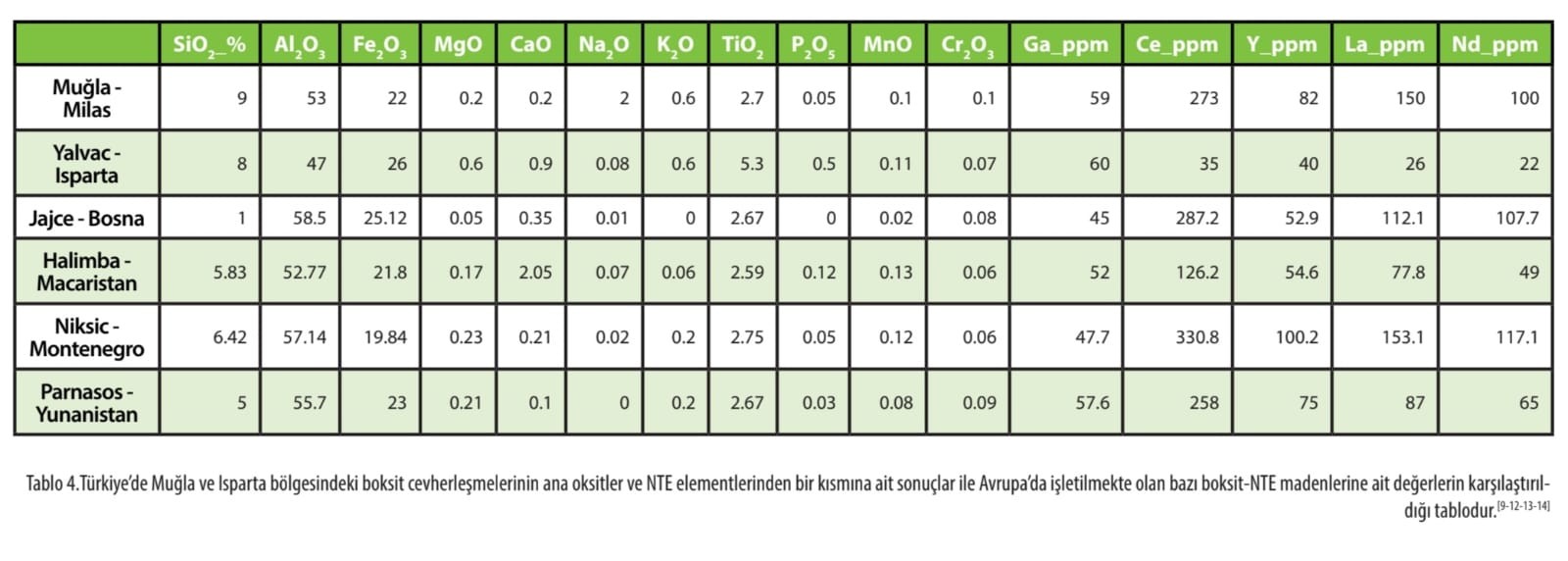 Öte yandan ülkemizde boksit cevherleşmesindeki NTE potansiyelleri üzerine çok fazla çalışma bulunmamaktadır. Muğla Milas bölgesi tarafında yapılan çalışmalarda karst-tipi-boksit cevherleşmeleri içerisinde NTE değerlerinde zenginleşmeler gözlenirken yine benzer olarak Isparta-Yalvaç bölgesindeki boksit cevherleşmelerinde de kısmi NTE zenginleşmeleri gözlemlenmiştir. Bu değerleri Avrupa'da ki çeşitli üretimi yapılan boksit çevhereleri ile kıyasladığımızda Türkiye'deki boksit değerlerindeki NTE değerlerinin de ekonomik olabileceği anlaşılmaktadır.