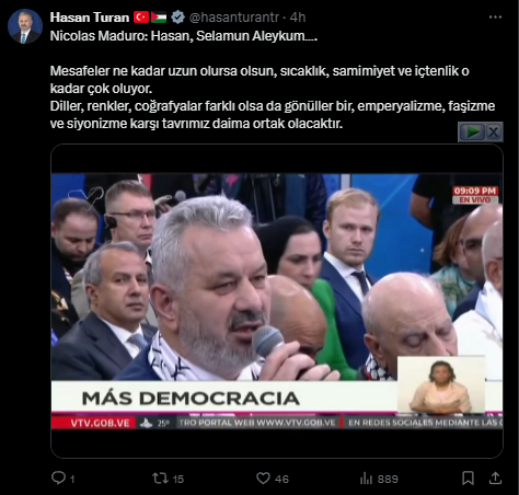 Nicolas Maduro: Hasan, Selamun Aleykum…. Mesafeler ne kadar uzun olursa olsun, sıcaklık, samimiyet ve içtenlik o kadar çok oluyor. Diller, renkler, coğrafyalar farklı olsa da gönüller bir, emperyalizme, faşizme ve siyonizme karşı tavrımız daima ortak olacaktır.