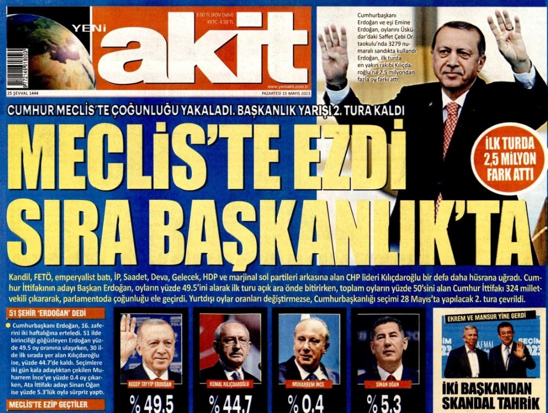 14 Mayıs seçimi sonuçlandı, Cumhur İttifakı Meclis'te ezici çoğunluk sağladı, cumhurbaşkanlığı seçimi ise 0,51 puanla ikinci tura kaldı. Akit söz konusu gelişmeyi, "Meclis'te ezdi, sıra başkanlıkta" manşetiyle duyurdu.