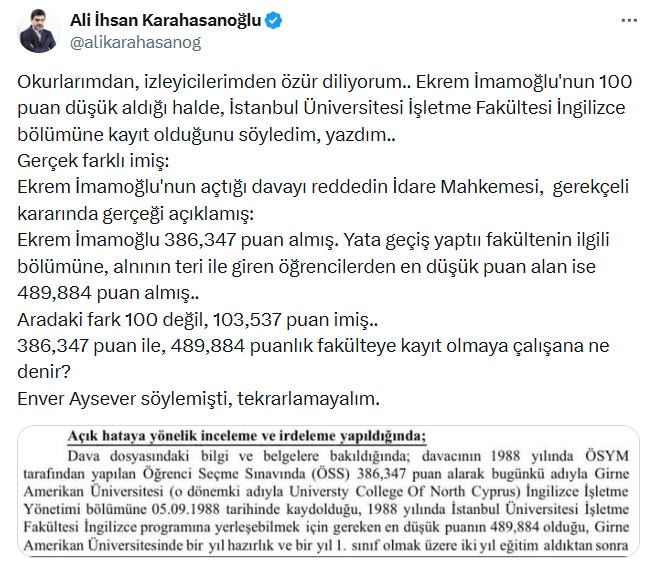 Yolsuzluk tutuklusu CHP'li Ekrem İmamoğlu’nun üniversite diplomasının iptaline karşı açtığı davayı reddeden İdare Mahkemesi gerekçeli kararında gerçeği açıkladı. Karara göre; İmamoğlu'nun 386,347 puanla yatay geçiş yaptığı fakültenin ilgili bölümüne girerken alın teri döken öğrenciler ise en düşük 489,884 puan aldı. Konuyla ilgili açıklama yapan Yeni Akit Gazetesi yazarı Ali İhsan Karahasanoğlu "Aradaki fark 100 değil, 103,537 puan imiş. 386,347 puan ile 489,884 puanlık fakülteye kayıt olmaya çalışana ne denir? Enver Aysever söylemişti, tekrarlamayalım." ifadelerini kullandı.