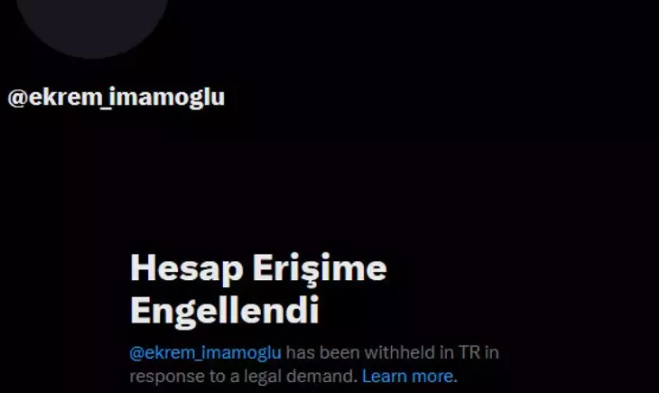 İstanbul Büyükşehir Belediyesi'ne yönelik yolsuzluk soruşturmasında tutuklanan ve görevden uzaklaştırılan Ekrem İmamoğlu'nun X hesabı mahkeme kararıyla erişime kapatıldı.