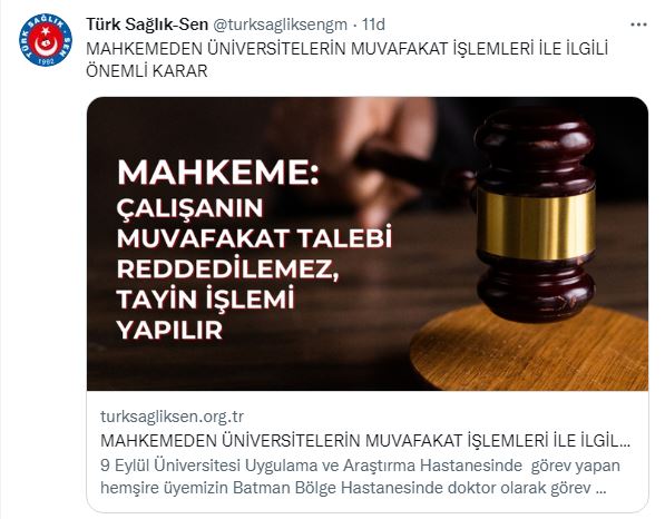 Türk Sağlık-Sen sosyal medya hesabından yaptığı paylaşımla üyesi olan bir hemşire için verilen hukuk mücadelesini kazandıklarını duyurdu.