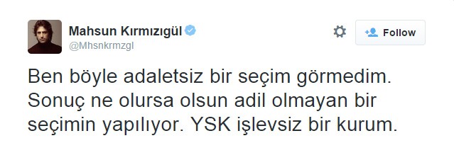 Twitter'dan yaptığı açıklamada seçim sürecinin adil olmadığını iddia eden Mahsun Kırmıgül, isim vermeden Cumhurbaşkanı Recep Tayyip Erdoğan'ı ve Başbakan Ahmet Davutoğlu'nu hedef aldı.