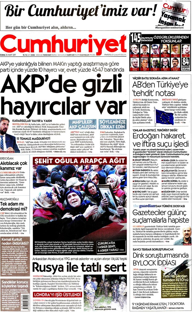 Cumhuriyet Gazetesi ise AK Parti'den gelecek %47 oranındaki 'Evet' oylarını "referandumda evet oyları %45-47 bandında" şeklinde vermesini doğru bulmuyorum. Bizim yaptığımız son araştırmada 'Evet' oyları %54'e dayanmış durumda.