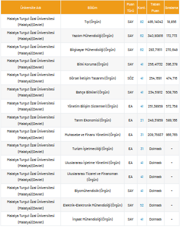 Malatya Turgut Özal Üniversitesi 2021 taban puanları ve yüzdelik dilimleri