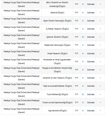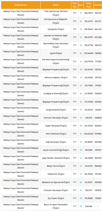 Malatya Turgut Özal Üniversitesi 2 yıllık taban puanları 2021 yüzdelik dilimleri ve kontenjan sayıları kaçtır?