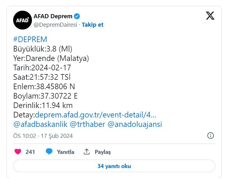 Malatya'da yerin 12 kilometre derinliğinde 3.8 büyüklüğünde deprem meydana geldi.