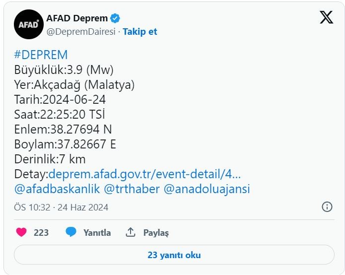 AFAD, Malatya'da 3.9 büyüklüğünde bir deprem meydana geldiğini duyurdu.