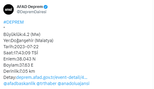 AFAD Malatya'da saat 17:43'da 4.2 şiddetinde bir deprem meydana geldiğini duyurdu.