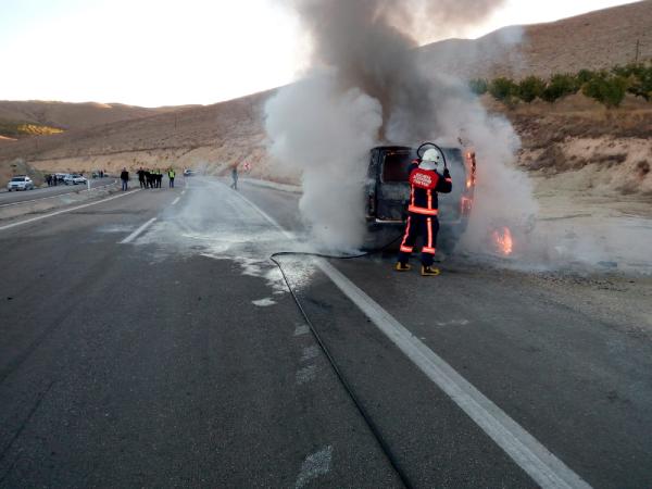 Malatya'nın Darende ilçesinde, hareket halindeyken alev alan minibüs, yangında kullanılamaz hale geldi.