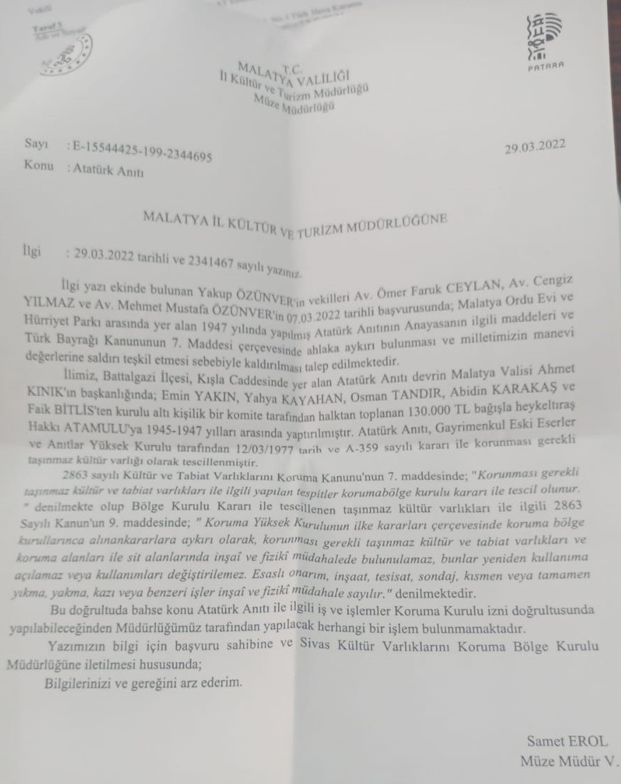 Başvuru dilekçesi hakkında kararını açıklayan Malatya İl Kültür ve Turizm Müdürlüğü tarafından verilen cevapta, "Bahse konu Atatürk Anıtı ile ilgili iş ve işlemler Koruma Kurulu izni doğrultusunda yapılabileceğinden Müdürlüğümüz tarafından yapılabilecek herhangi bir işlem bulunmamaktadır. Yazımızın bilgi için başvuru sahibine ve Sivas Kültür Varlıklarını Koruma Bölge Müdürlüğü'ne iletilmesi hususunda gereğini arz ederim." ifadeleri kullanılmıştı.