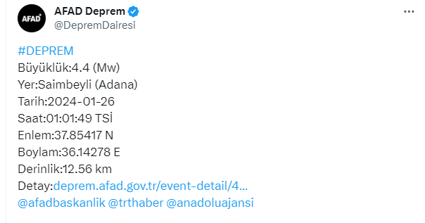 AFAD verilerine göre, merkez üssü Adana'nın Saimbeyli ilçesinde saat 01.01’de 4,4 büyüklüğünde bir deprem meydana geldi.