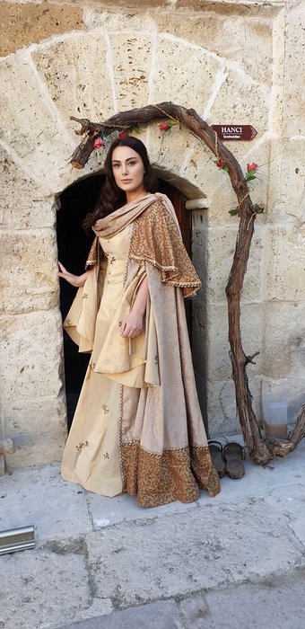 "15 gündür buradayım. Dönem işi çekiyoruz, çok kıymetli Malazgirt hikayesi. Filmde Selçuklu mimarisini kullanıyoruz, platoda değil gerçek mekanlarda çekim yapmak önemli, bu tarihi korumak gerekiyor. Film ekibi genel olarak erkek kadrodan oluşuyor ama ben setin kraliçesiyim. Bizans kraliçesi 'Eudokia'yı oynuyorum. Dönem işlerine yakıştığımı söylüyorlar. 'Keşke o dönemde yaşasaydım' demiyorum, yaşadığım zamandan memnunum. Her şey değişiyor ama insanlık, insan ruhu, psikolojisi aynı kalıyor. Zaman, mekan, kostüm değişse de mücadeleler aynı. Bütün kadınlar bir kraliçe kadar güçlü, ileri görüşlü ve mücadeleci. Bu dönemde milli duygularımız güçlendi, o yüzden tarih merak ediliyor. Filmde İslam sancağı dikmemiz, örfü, adeti, değerlerimizi, musikimizi çok iyi yansıtmak gerekiyor çünkü biz ancak kendi kültürümüzle varolup ilerleyebiliriz. Konya halkı inanılmaz sıcakkanlı. Mevlana ve Sadreddin Konevi türbelerini ziyaret ettim. Sette de yalnız kalmadım, nişanlım buradaydı. Allah evliliği ne zaman nasip eder bilmiyorum ama saygıyla ilerleyen bir ilişkimiz var."
