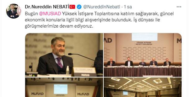 Hazine ve Maliye Bakanı Nebati, Twitterdaki hesabından yaptığı paylaşımda, "Bugün MÜSİAD Yüksek İstişare Toplantısı´na katılım sağlayarak, güncel ekonomik konularla ilgili bilgi alışverişinde bulunduk. İş dünyası ile görüşmelerimize devam ediyoruz" dedi.