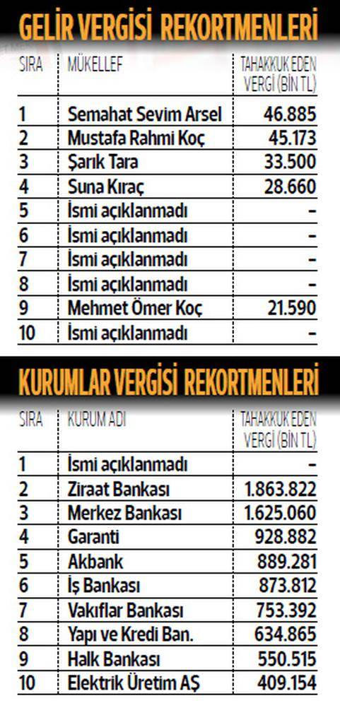 Gelir vergisinde ise Semahat Sevim Arsel geçen yıl olduğu gibi rekortmen oldu. İkinci sırada Rahmi Koç, üçüncü sırada Şarık Tara, dördüncü sırada Suna Kıraç geldi. 5, 6, 7 ve 8 ismini açıklamazken, 9. sırada Ömer Koç yer alırken, gelir vergisi rekortmenleri arasında da 53 kişi isminin gizli kalmasını istedi.