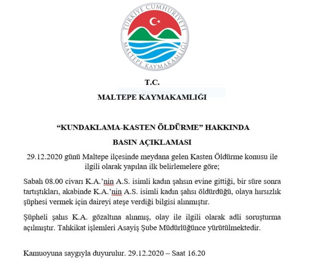 Maltepe Kaymakamlığınca yapılan açıklamada, "29 Aralık 2020 günü Maltepe ilçesinde meydana gelen kasten öldürme konusu ile ilgili olarak yapılan ilk belirlemelere göre; sabah 08.00 civarı K.A.’nin A.S. isimli kadın şahsın evine gittiği, bir süre sonra tartıştıkları, akabinde K.A.’nin A.S. isimli kadın şahsı öldürdüğü, olaya hırsızlık şüphesi vermek için daireyi ateşe verdiği bilgisi alınmıştır. Şüpheli şahıs K.A. gözaltına alınmış, olay ile ilgili olarak adli soruşturma açılmıştır. Tahkikat işlemleri Asayiş Şube Müdürlüğünce yürütülmektedir" ifadelerine yer verildi.