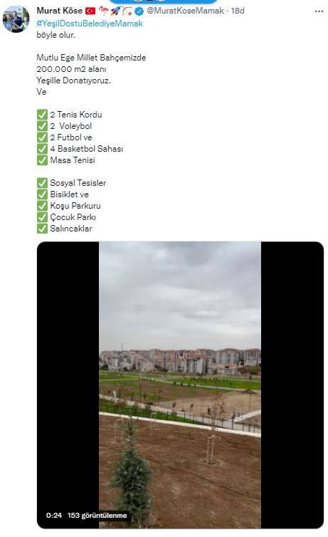 Mamak Belediye Başkanı Murat Köse sosyal medya hesabı üzerinden Mutlu Ege Millet Bahçesi’nin 200.000 m2 alanı yeşille buluşturucaklarını söyledi.