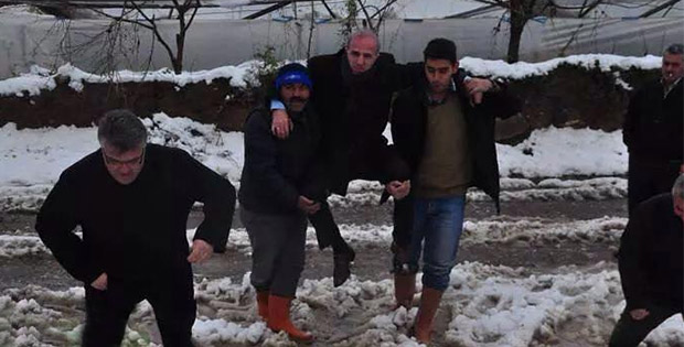 Hasar tespit çalışmaları sırasında objektiflere yansıyan bir kare ise dikkat çekti. Fotoğrafta Zurnacı'nın kaygan ve çamurlu zeminden etkilenmemek için çiftçilerin omuzlarına çıktığı görülüyor.