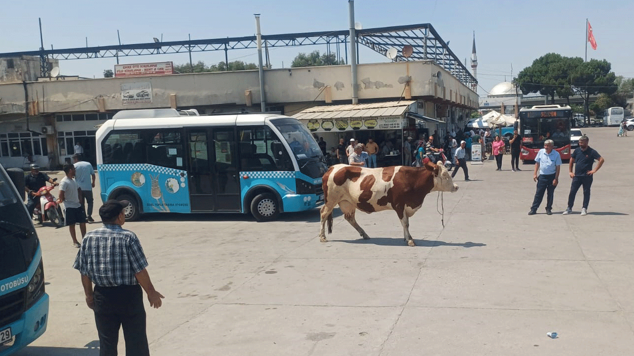 Manisa'nın Salihli ilçesinde kesim için getirildiği mezbahadan kaçan inek ortalığı birbirine kattı. Firari inek, otogarda yakalandı.