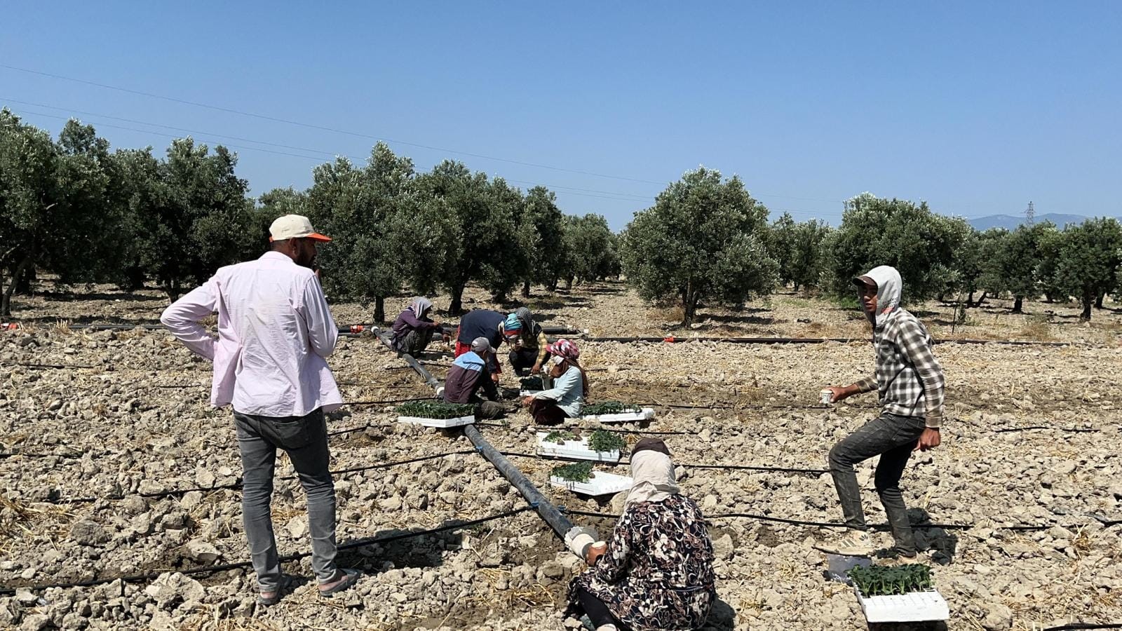 Suriyeliler çoluk çocuk Akhisar ovasında 38 derece sıcaklıkta, sabahtan akşama kadar karpuz fidanı dikiyor.