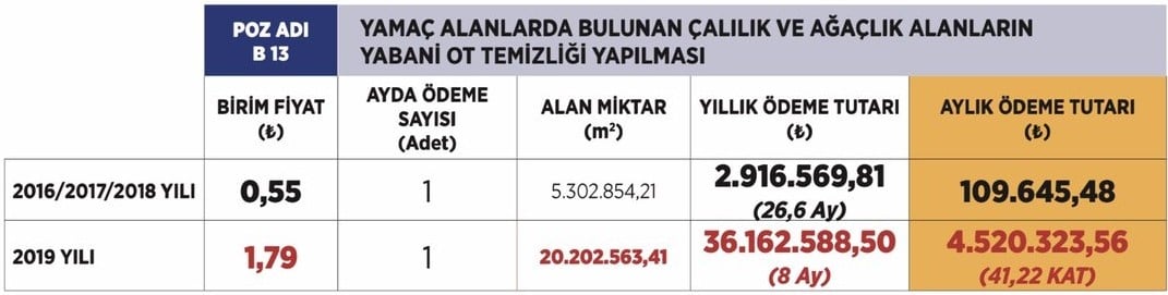 Melih Gökçek başkanlığındaki 2016, 2017, 2018 yılı ihalelerinde aylık ödeme bedeli 109 bin 645 TL iken, Ankaralılar, Yavaş’ın ihalesiyle yabani ot temizliğine 41 kat artışla her ay 4 milyon 520 bin 323 TL ödeyecek. Temizlik alanının 5 milyondan 20 milyona çıkarılmasına rağmen sürenin 26 aydan 8 aya indirilmesi, aylık ödeme tutarının ise 41 kat artırılarak 109 binden 4,5 milyona çıkarılması ihale vurgunu olarak nitelendirildi.