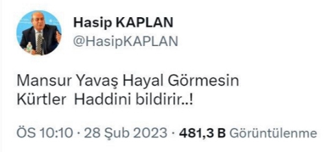 Mansur Yavaş'ın adaylık açıklamasına HDP'den tepki geldi. Sosyal medya hesabından paylaşımda bulunan HDP'li Hasip Kaplan, ABB Başkanı'nın adaylığına karşı çıktıklarını ifade ederek "Mansur Yavaş hayal görmesin. Kürtler haddini bildirir." dedi.