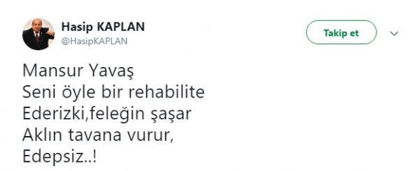 HDP'li Hasip Kaplan'ın tepkisi ise daha sert oldu. Kaplan, "Mansur Yavaş... Seni öyle bir rehabilite ederiz ki, feleğin şaşar. Aklın tavana vurur, edepsiz!" dedi.