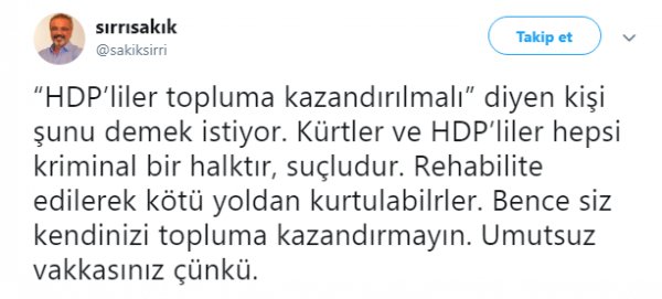 Sırrı Sakık, "HDP’liler topluma kazandırılmalı' diyen kişi şunu demek istiyor. Kürtler ve HDP’liler hepsi kriminal bir halktır, suçludur. Rehabilite edilerek kötü yoldan kurtulabilrler. Bence siz kendinizi topluma kazandırmayın. Umutsuz vakkasınız çünkü." yorumunu paylaştı.