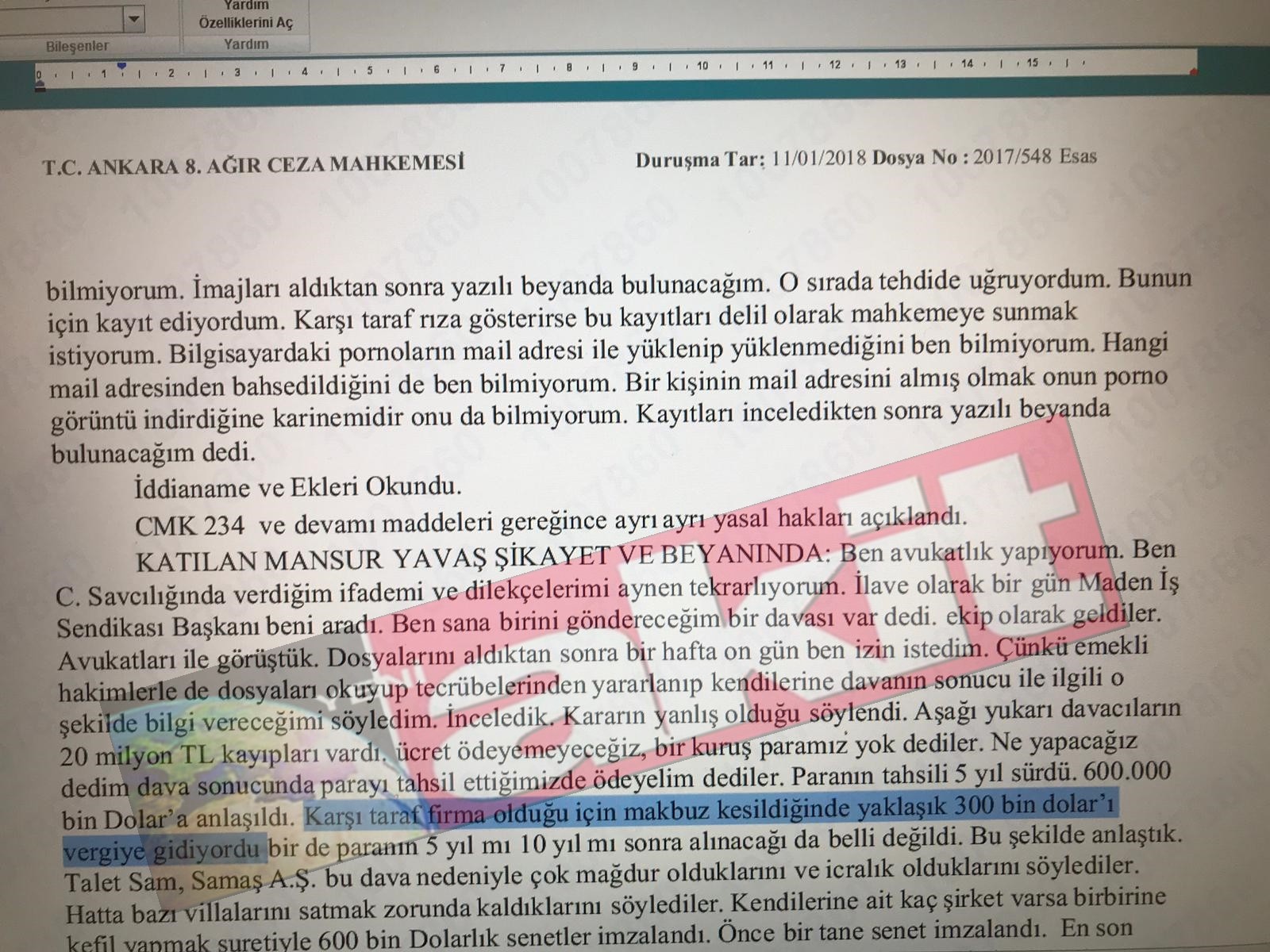 Mansur Yavaş mahkemede verdiği ifadede niçin avukatlık sözleşmesi yapmadığını da itiraf ederek; "Karşı taraf firma olduğu için makbuz kesildiğinde 300 bin doları vergiye gidiyordu. Bu sebeple senet imzalandı" diyerek vahim gerçeği gözler önüne seriyor.