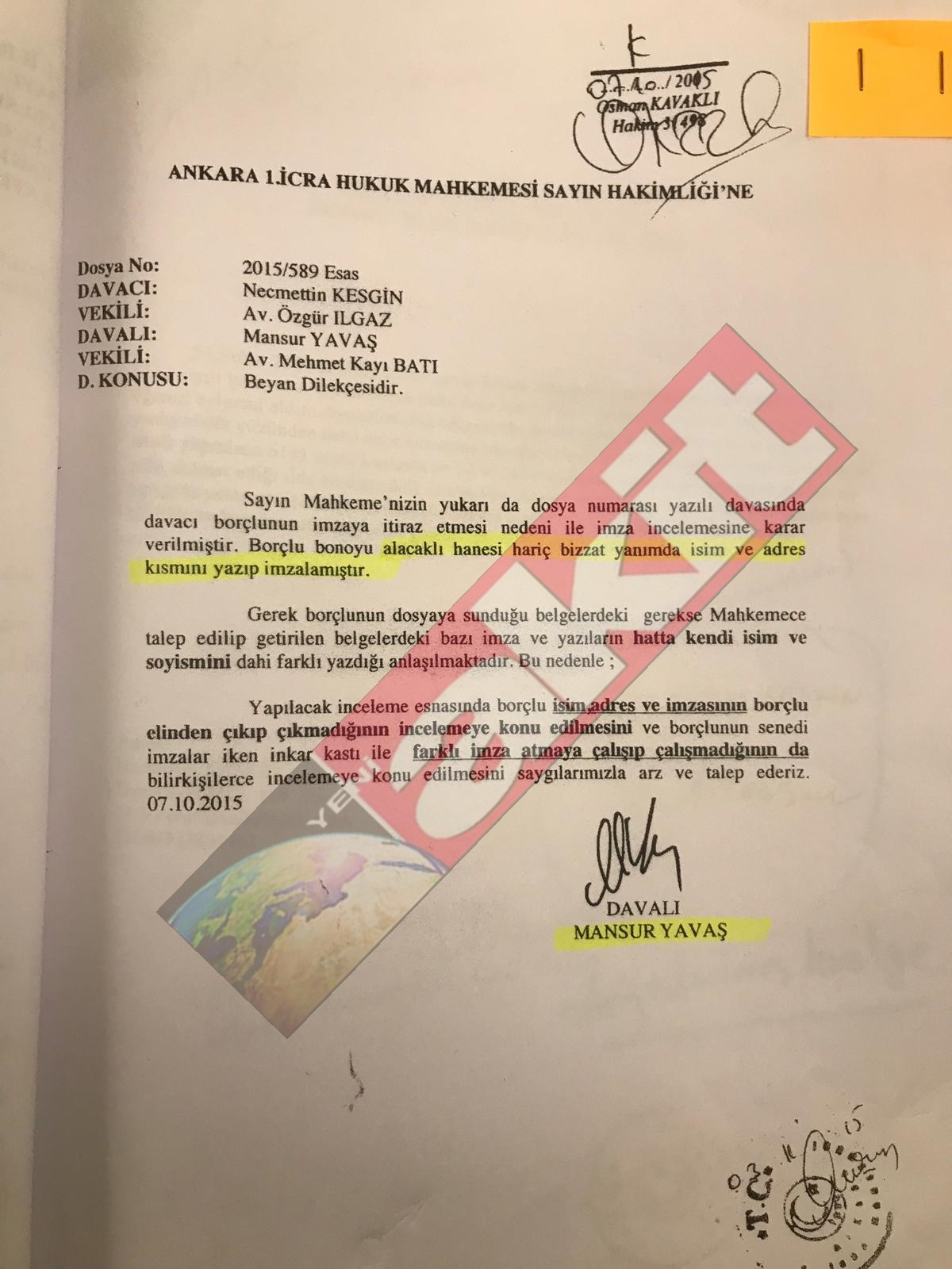 Ankara 1.İcra Hukuk Mahkemesine bizzat verdiği dilekçede Mansur Yavaş; "Borçlu bonoyu alacaklı hanesi hariç bizzat yanımda isim ve adres kısmını yazarak imzalamıştır" diyor.