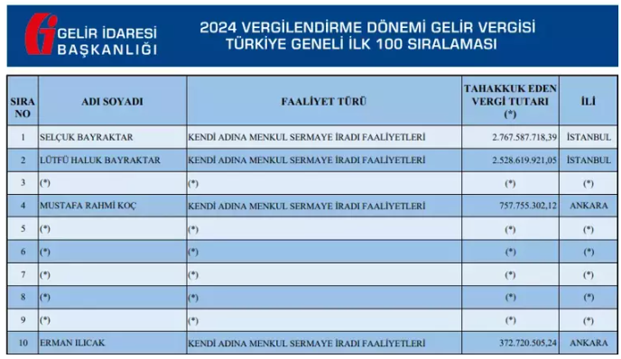2024 yılı vergi rekortmenleri listesinde zirve, savunma sanayiinde devrim yapan Baykar yöneticileri Selçuk Bayraktar ve Haluk Bayraktar’a ait oldu. Selçuk Bayraktar 2 milyar 767 milyon lira, Haluk Bayraktar ise 2 milyar 528 milyon lira gelir vergisi ödeyerek, toplamda 5 milyar 296 milyon lira katkı yaptı.