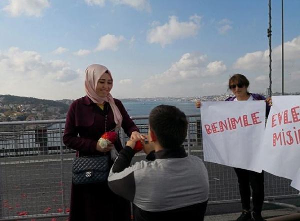 Köprünün ortasında bir anda yapılan sürpriz evlilik teklifi sırasında çiftin arkadaşları da, "Benimle Evlenir misin Büşra?" yazılı dövizler taşıdı. Yunus Emre Er'in yaptığı evlilik teklifine arkadaşı Büşra Bakkal "Evet" karşılığını verdi. Bakkal'ın bu cevap çevredekiler tarafından alkışlanırken o anlar cep telefonu kamerasına da kaydedildi.