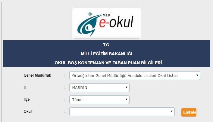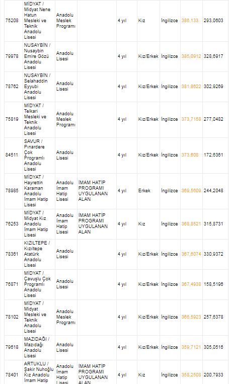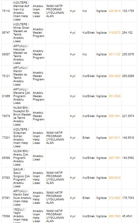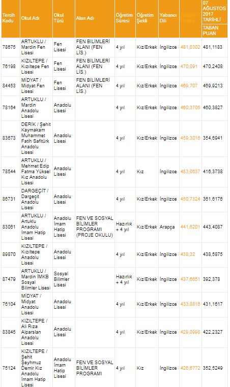 Mardin liseleri taban puanları ve yüzdelik dilimleri 2018 2019 MEB e okul