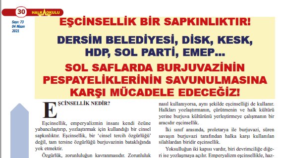 Marjinal sol dergilerinden Halk Okulu, Tunceli Belediyesi, HDP ve diğer tüm kendini sol tarif eden oluşumların aksine, eşcinsel sapkınlıkla mücadele edeceklerini duyurdu.